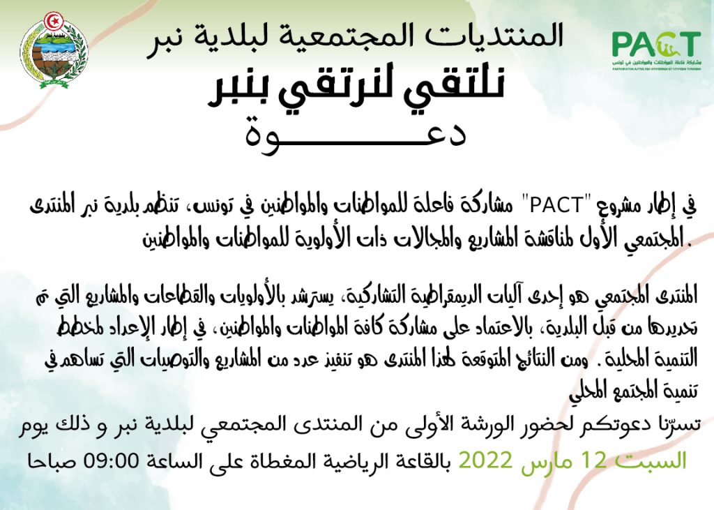 في اطار مشروع مشاركة فاعلة للمواطنات والمواطنين في تونس تنظم بلدية نبر المنتدى المجتمعي الاول لمناقشة المشاريع والمجالات ذات الاولوية للمواطنات والمواطنين
